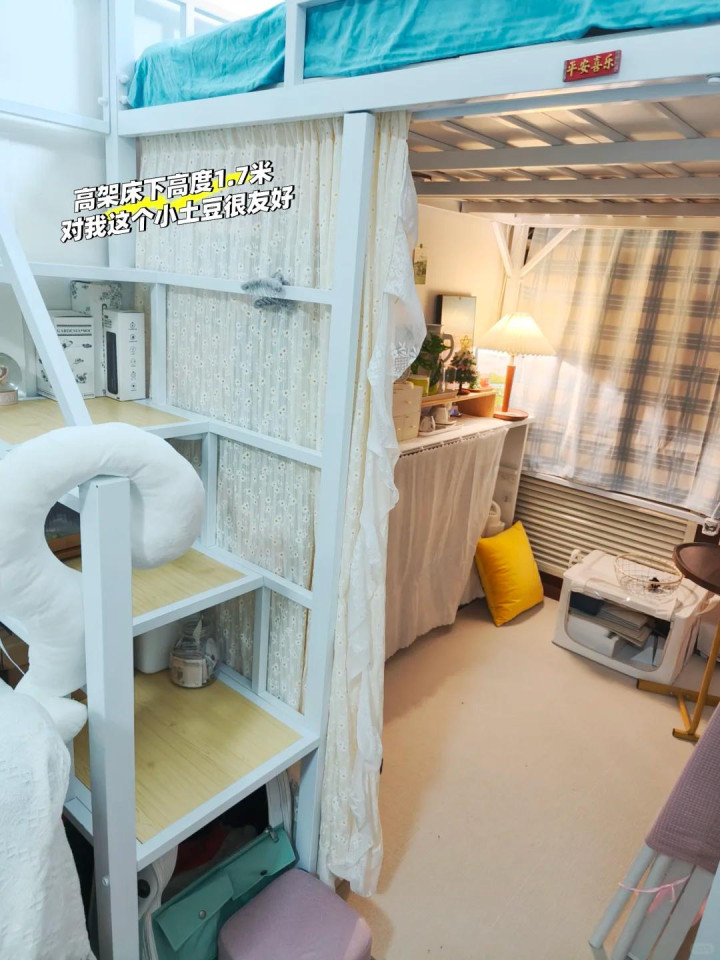 ①层高比较高,最内侧放了一张高架上下床,但是顶部还有2米左右的垂直空间,待在上铺一点也不会觉得憋屈;